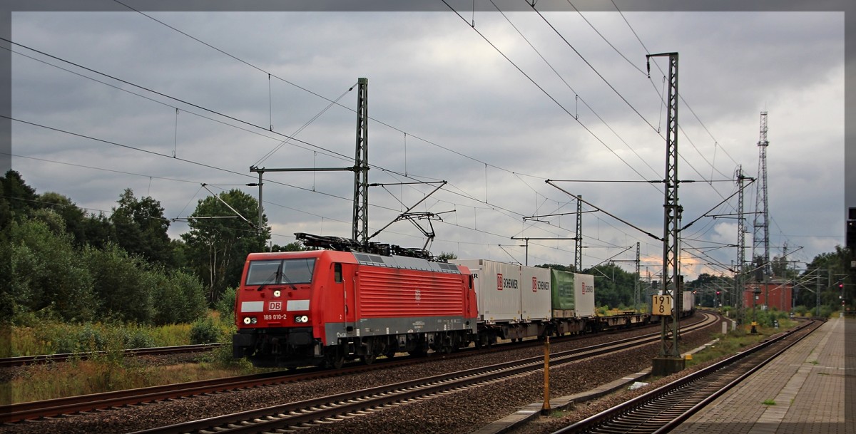 189 159 der MRCE, für DB, mit Schwellenzug aus Möllenhagen in Richtung Rostock am 15.04.2016 bei Vielist