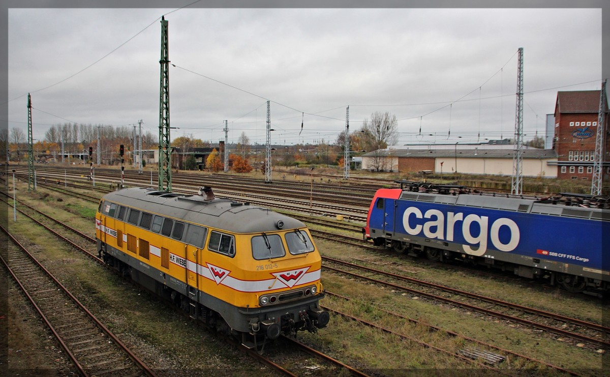 Die 216 122 (Lok 10) und die 216 012 (Lok 11) von Wiebe abgestellt in Möllenhagen am 22.05.2015