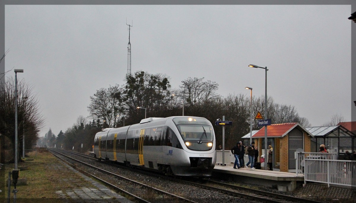 VT 0013 der NEB bei der Ausfahrt aus dem Bahnhof Templin am 06.03.2016